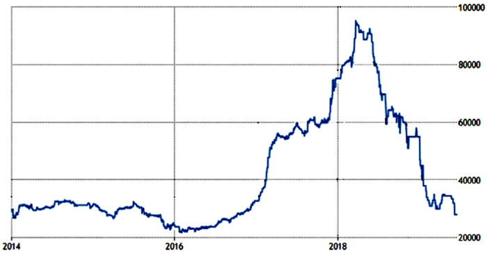 近5年钴的价格变化趋势如图 6所示,可以看出,钴逐渐进入了又一轮大周期,2016—2017年供给不足,供给端的收储、囤货和增加库存等造成一轮价格暴涨,2018年下半年企业快速扩产和高库存造成的供大于求价格暴跌。而刚果(金)政府政策的不确定性(新矿业法的实施等),以及不稳定的时局,也势必将给未来钴的价格带来更多的扰动。
