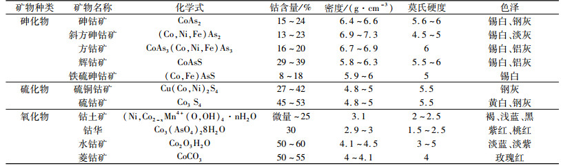 表 1 常见的钴矿物及其性质 Table 1 The common cobalt minerals and their properties