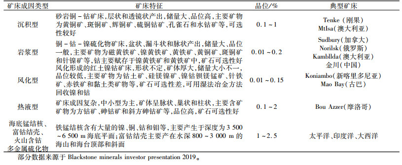 人类目前商业开发的钴矿资源均来自陆地钴矿床,陆地钴矿床主要有沉积型层状铜钴矿床、岩浆型硫化镍-铜-钴-铂族矿床、热液型钴矿床、风化型红土镍钴矿床四种类型。除了这四种主要的钴矿床类型外,还存在一些资源量较小的其他类型的钴矿床,例如黑色页岩型镍-铜-锌-钴矿床、密西西比河谷型铅-锌-钴-镍硫化物矿床等,这些类型的矿床资源量仅占已知的地球钴资源量的1%,占到陆地钴矿资源量的8%。