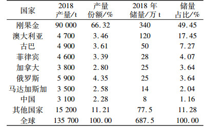 地球上已发现的钴矿物多数与铜、镍、金和铁等矿产共伴生,全球钴产量仅有2%左右产自独立钴矿。根据USGS 2019年统计,全球已探明的陆地钴矿资源量为2 500万t,储量为688万t,按2018年世界钴矿产量13.6万t计,静态保障年限达到50年。在大西洋、印度洋和太平洋底部发现了超过12 000万t的钴矿资源存在于大洋锰结核和大洋富钴结壳中,由于技术和经济原因,这些资源目前还未能得到开发利用。全球陆地钴矿资源分布广泛,钴矿资源主要赋存于刚果和赞比亚的沉积型层状铜钴矿床中,澳大利亚、古巴、菲律宾和马达加斯加等国的红土型镍钴矿床,以及澳大利亚、加拿大和俄罗斯等国的岩浆型镍-铜硫化物矿床中。尽管钴矿分布广泛,但是除了摩洛哥的Bou Azzer钴矿是以砷钴矿为主矿产的独立钴矿外,世界其他钴矿均作为铜矿和镍矿等矿产的共伴生矿产产出,目前只有刚果、澳大利亚、古巴、加拿大和俄罗斯等少数几个国家的钴矿才能经济利用。