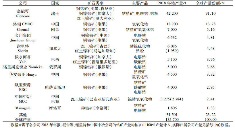 2010年以后,中国经济增长速度放缓,铜和镍价格连续5年持续低迷,钴矿供应过剩,全球钴矿生产出现波动,部分钴矿企业减产,其中,嘉能可旗下的Katanga铜钴矿2015年停产维修,导致2016年全球钴矿产量出现下降。电动汽车快速发展导致的钴需求增长刺激了钴矿生产,到2017年,全球钴矿产量恢复到12万t,2018年钴矿产量增长到13.56万t。