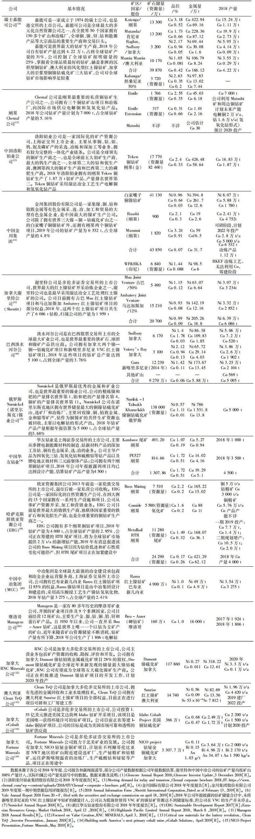 | 数据来源于各公司2018年年报、公司报告和新闻报道等,部分公司产量数据根据公司年报数据估算,谢里特和中国中冶公司的钴矿产量均按矿山100%产量计入,实际归属公司产量见括号中的数据。数据来源及说明:(1)Glencore Annual Report 2018;Glencore Investor Update,3 December 2018[R]。(2)洛阳栾川钼业集团股份有限公司2018年年度报告[R]。(3)Meeting demand for today and tomorrow,Chemaf corporate brochure 2018, 07.https://www.chemaf.com/wp-content/uploads/2018/07/Chemaf-corporate-brochure.pdf[R]。(4)金川国际有限公司2018年年度报告[R];金川集团股份有限公司2019年度第一期中期票据信用评级报告[R]。(5)2018 Annual Information Form, Sherritt International Corporation, Dated as of February 13, 2019[R]。(6)Vale Annual Report 2018 Form 20-F,filed with the securities and exchange commission on april 18, 2019[R];2018年公司年报披露的钴矿储量合计中,未将新喀里多尼亚的VNC红土镍钴矿中钴矿的储量计入,公司认为低镍价使得VNC矿的镍钴矿资源达不到储量标准,但公司在VNC的生产并未停止。(7)Nornickel Annual Report 2018[R]。(8)浙江华友钴业股份有限公司2018年年度报告[R]。(9)ERG Sustainable Development Report 2017[R];Eurasian Resources Group: Market Outlook 2018,April 12,2018[R]。(10)Highlands Pacific Limited Annual Report 2018,March 8,2019[R]。(11)Managem 2018 Annual Results[R]。(12)Focused on Value Creation,RNC MINERALS,April 3, 2018[R]。(13)Critical raw materials for the battery revolution, Clean TeQ, Investor Presentation, January 2018[R]。(14)Building north America’s next primary cobalt mine,eCobalt Solutions, April 2019[R]。(15)NICO Project Presentation,Fortune Minerals,May 2019[R]。 |