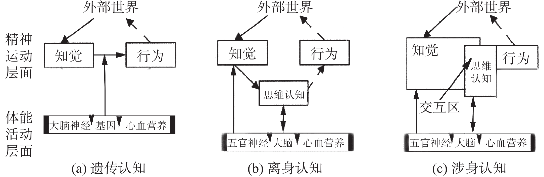 一个人的精神活动,会随着不同时期的认知模式发生变化。刚出生的婴儿接触到母亲的乳房就会去吸吮,这是遗传基因产生的生理感知,属于哲学家定义的具身认知体验[6],这种类型的认知模式可称为遗传认知(见图1a)。老师在课堂上详细讲述秦朝的历史时,学生的大脑里会产生有关秦朝及其属性的记忆,哲学家称这种认知模式为离身认知(见图1b)。但是,当学生参观了秦始皇陵兵马俑,他们对秦朝的历史会产生更加深刻的认知,这种认知属于涉身认知(见图1c)。经典的自然科学研究强调理性和客观,把人作为认知主体,不准主体带着个人情感和功利进入认知活动,这种研究方式偏向于离身认知。艺术创作是人类理解和认知世界的另外一种形式,要用形象表达人对世界的感知和主观认识,所以艺术家认知世界的方式多属于涉身认知。在涉身认知过程中,对实体对象的感知和思维是融合贯通的,把形象思维和抽象思维有机地结合非常重要。涉身认知对科学认知也非常重要,物理和化学实验是中学生学习涉身认知的重要的环节。