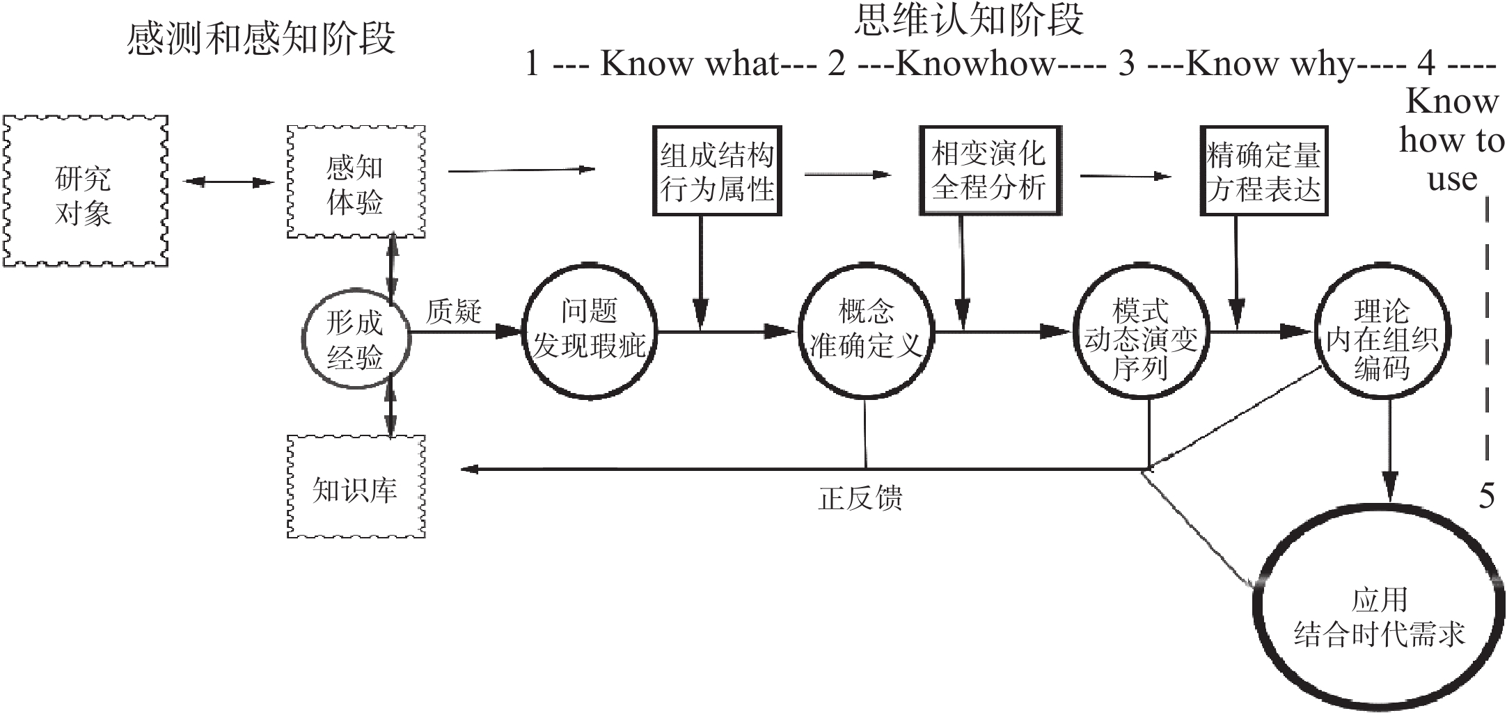 在取得感知体验后,科学研究首先要对现有的理论进行质疑,科学问题的提出和严格定义是系统认知的第一个环节(见图3)。根据科学的新发现和新公布的数据,思考现有理论中是否存在不够理性(如假设条件过多)、不够客观(如与新数据符合不好)、不够精准和不够系统的地方,然后判断问题之所在。系统认知的第二个环节是根据对研究对象的组成、结构、属性和行为的观测,形成新的更加深入的概念,解决know what的有关问题。系统认知的第三个环节是观测系统的行为、秩序和相态变化,了解系统生成和演化模式,解决know how的有关问题,对系统形成演化有全程的理解。通过逻辑推演和模拟实验,有可能得到多个可拟合数据的演化模式,要不断对相互作用的内在关联模式进行优化,求得最优的模型。系统认知的第四个环节是思考研究对象的组织机制和动力来源,解决know why的有关问题,形成科学的理论。20世纪以前由于观测和实验手段有限,取得的数据可能不充分,在建立理论时常常必须进行简化,消除一些次要元素的影响,才能通过逻辑推理取得表达因果关系的方程式,因此产生研究科学理论的普适性和鲁棒性评价的问题。系统认知的第五个环节是在理论得到初步验证之后,了解理论的可能应用领域,针对应用目标构思具体化和定量化的应用原理。近年来,遥测遥感和显微观测等观测技术取得的突破性进展,为系统认知导向科学理论创新开辟了一条宽阔的道路。
