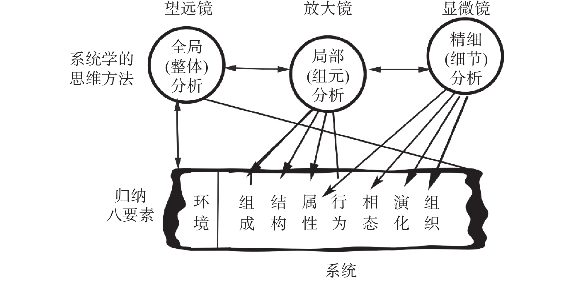 三、系统学认知在哲学界和科学界讨论系统论,已经有几百年的历史。钱学森提出系统学的认知思维方法,开辟了一个新的认知科学领域[2-3]。系统学定义系统是由不同质组元相互作用形成的整体组织,对应各态遍历的宇宙中所有能量相对独立的奇点[20-23]。由系统作为组元相互作用形成的超级系统称为体系(SoS)。系统学的思维包括整体分析、组元分析和事件细节分析三大部分,对应成为观测事物的望远镜、放大镜和显微镜(见图7)。系统学的思维方法在整体与局部、相互作用和组织机制等方面,比哲学上的系统论有更多的考虑。