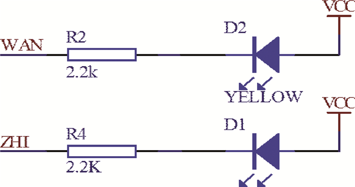 指示灯模块主要包括LED和限流电阻。LED显示的优点在于其物理性能可靠, 可以在很大程度上防止摔落和冲击造成的影响, 且LED模块的工作电压低, 需要的工作电流小, 运行稳定可靠。