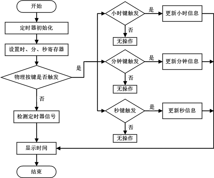 利用定时器与软件结合实现1 s定时中断, 每产生一次中断, 存储器内相应的秒值加1;若秒值达到60, 则将其清零, 并将相应的分字节值加1;若分值达到60, 则清零分字节, 并将时字节值加1;若时值达到24, 则将时字节清零。同时因为加入了物理按键, 所以当按键被触发后, 系统也会执行上述操作。