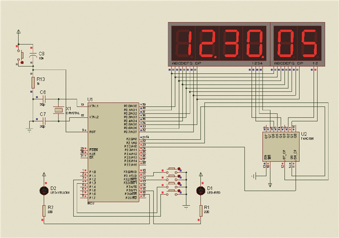 设计核心是用单片机作为主控制器和内部时钟电路;电源模块提供能量用以驱动时钟系统的运行;晶振电路和复位电路分别用来辅助产生时钟信号和使系统复位;数码管驱动模块使得系统可以从视觉上正常显示时间;指示灯模块保证系统在切换时制时有一个清晰明了的提示效果;按键模块是为了系统可以正常的调时和归零。