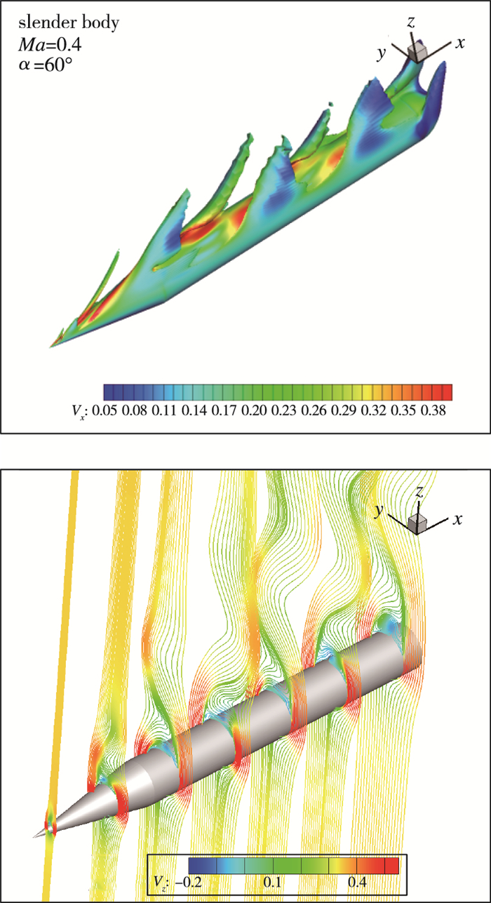 飞行器空间流场如图 10所示, 在大攻角飞行时, 背风区出现了较大的涡流动, 气动非线性、非定常特性明显.