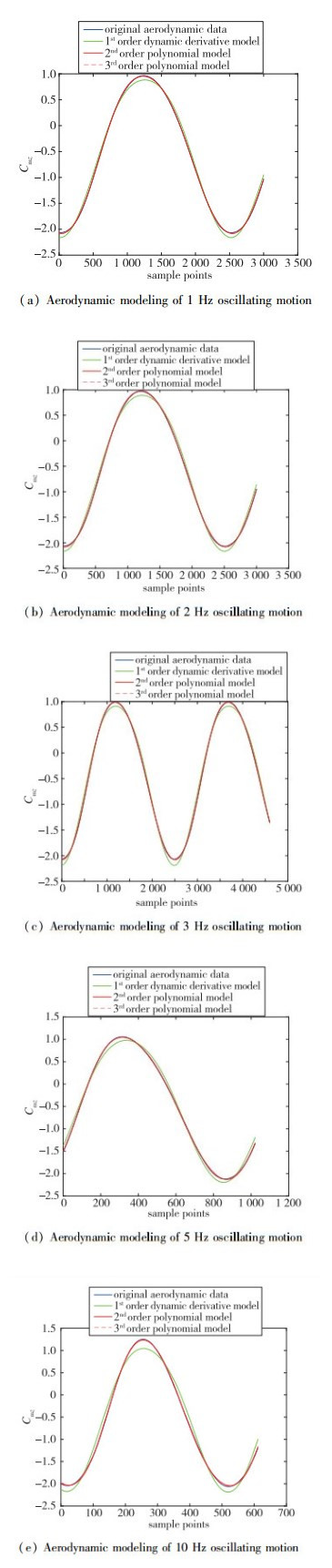 计算状态为: Ma=0.4, 振荡运动的平衡攻角为70°, 振幅10°, 频率分别为1,2,3,5,10 Hz.气动力模型的一般函数形式为