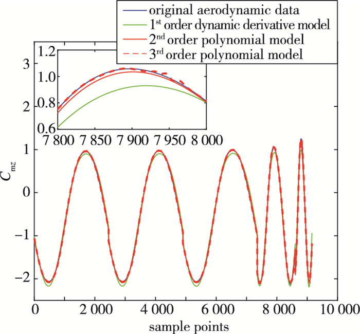 $ \begin{array}{*{20}{l}} {{C_{{\rm{m}}z}} = {C_{{\rm{m}}z0}} + C_{{\rm{m}}z}^\alpha \alpha + C_{{\rm{m}}z}^{{\omega _z}}{\omega _z} + C_{{\rm{m}}z}^{\alpha {\omega _z}}\alpha {\omega _z} + C_{{\rm{m}}z}^{{\alpha ^2}}{\alpha ^2} + }\\ {{\kern 1pt} {\kern 1pt} {\kern 1pt} {\kern 1pt} {\kern 1pt} {\kern 1pt} {\kern 1pt} {\kern 1pt} {\kern 1pt} {\kern 1pt} {\kern 1pt} {\kern 1pt} {\kern 1pt} {\kern 1pt} {\kern 1pt} {\kern 1pt} {\kern 1pt} {\kern 1pt} {\kern 1pt} {\kern 1pt} {\kern 1pt} {\kern 1pt} {\kern 1pt} {\kern 1pt} {\kern 1pt} {\kern 1pt} {\kern 1pt} {\kern 1pt} {\kern 1pt} C_{{\rm{m}}z}^{\omega _z^2}\omega _z^2 + C_{{\rm{m}}z}^{\alpha \omega _z^2}\alpha \omega _z^2 + C_{{\rm{m}}z}^{{\alpha ^2}{\omega _z}}{\alpha ^2}{\omega _z} + C_{{\rm{m}}z}^{\omega _z^3}\omega _z^3} \end{array} $ |