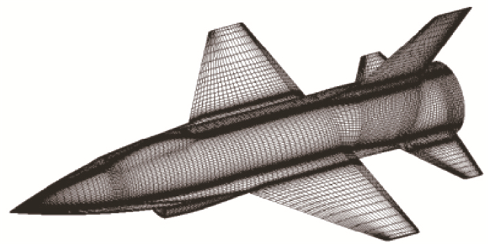 为了验证CFD计算方法的有效性, 进行了标模的气动计算.校核计算选择的SDM标模是AEDC基于F-16简化外形提出的一个标准动态模型[33], 如图 3所示, 由机身、机翼、前缘边条、平尾、垂尾、腹鳍、座舱以及进气道组成.计算网格总数为5×105, 图 4展示了表面网格分布.计算参数为: Ma=0.6, 纵向质心位置Xcg=0.584, 减缩频率kr=0.034.为了节省计算量, 俯仰方向采用了半模计算.
