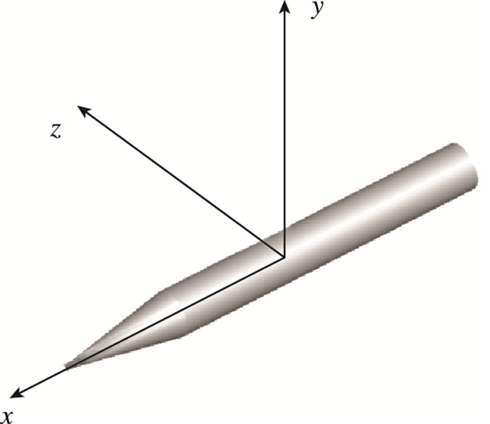 采用轴对称导弹简化模型作为研究对象, 外形尺寸和计算坐标如图 7所示:前面为锥形, 后面为光弹身, 无尾翼, 采用国内航天系, 机体坐标表示为: x轴为轴向,y轴为法向, z轴为侧向.模型全长1 000 mm, 底部直径100 mm, 参考长度为底部直径, 参考面积为底部面积.质心为距头部顶点500 mm处.