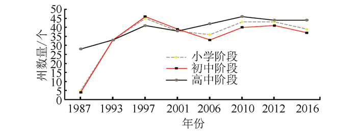 图 1 1987—2016年对各学段体育课程有强制性规定的州数量 Figure 1 Numbers of states requiring students to takephysical education in 1987—2016 |