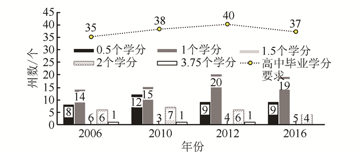 2.3.3 各州对高中体育教育毕业学分的要求高中阶段是学生接受体育教育的重要阶段,也是培养学生树立终身体育意识的重要时期。在美国,高中阶段的体育教育以学分的形式呈现,大多数州要求高中生必须修满规定的体育教育学分才能毕业[41]。由图 2可知,2006—2012年,各州要求高中生必须完成充足的体育教育学分才能毕业的态度呈现不断上升的趋势,2012年为40个州(占80%),2016年则又出现了回落,减少到37个。进一步研究发现,美国大多数州虽然都要求高中生修完规定的体育学分才能毕业,但总体学分要求并不高,其学分要求比例最高的为1个学分,次之分别为0.5个学分、2个学分和1.5个学分,这也就意味着大多数高中生只参加了1学年甚至1个学期的体育课。这10年期间,只有1个州(3.75个学分)要求高中生每学年都要参加体育课。要让学生在如此之短的体育课时中学会和掌握健康知识和体育技能,似乎很难。此外,美国还有13个州并未对高中生的体育毕业学分进行要求,这也就意味着部分高中生在高中阶段根本没有接受正规、组织化的体育教育。由上可知:美国仍有部分州未对高中体育毕业学分进行明确规定;高中阶段的体育教育学分相对过少,1个学分和0.5个学分所占比例最高,高中生的体育课程时数并不充足。