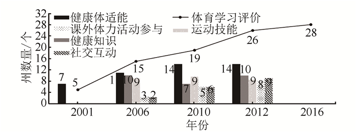 2.4.2 各州对学生体育学习的评价科学合理的学习评价能调动学生学习体育的积极性和主动性,促进全体学生的全面发展[57]。美国中小学对学生体育学习的评价内容最初主要集中于体适能这个单一的指标上,包括有氧运动、肌部力量、肌肉耐力、身体构成、柔韧性测试[58]。有学者提出,这种单一的体适能评价仅局限于人体的生理及身体形态方面,并不能准确反映学生的体育学习效果,对于帮助学生形成积极的生活方式以及体育知识的具体应用并未产生实质性的促进作用[59]。鉴于此,加之体育教育功能的不断拓展和学生对体育学习的诉求,美国各州一直致力于不断完善学校体育学科的评价指标。由图 3可知,全美各州对学生体育学习的评价呈现出以下2个较为明显的趋势。