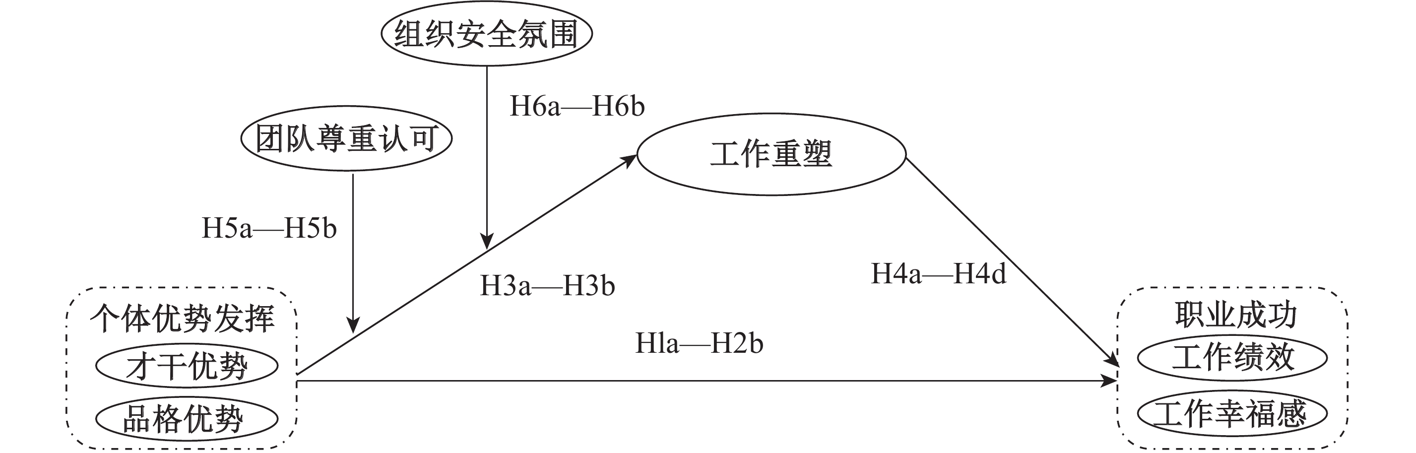 综上所述,本研究基于工作重塑研究视角,引入团队尊重认可和组织安全氛围作为边界条件,构建老年员工个体优势发挥对职业成功的作用机制理论假设模型(见图1)。
