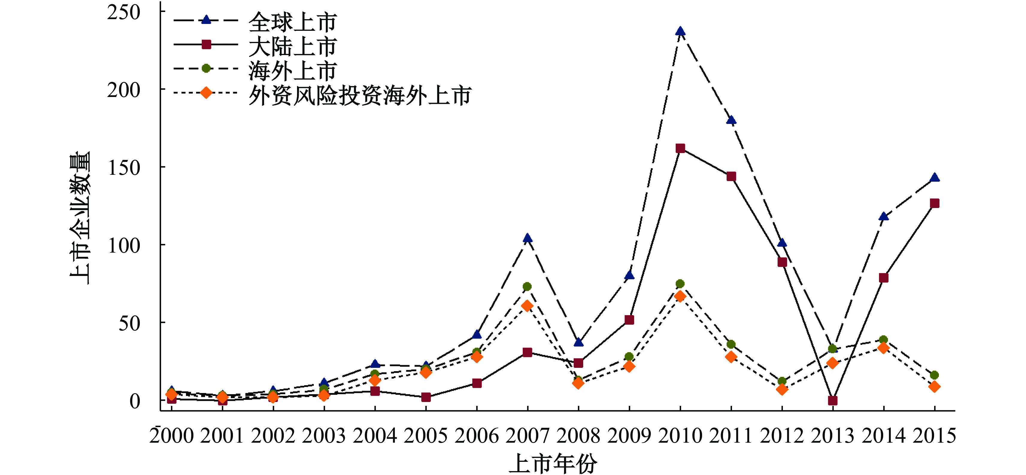 2009年创业板开通前,国内上市(主板和中小板)的审批条件十分严格,对企业规模、连续盈利和公司治理结构等方面有硬性规定,使不少外资风险投资支持的高新技术企业无法满足国内上市标准。相比国内上市,海外上市在资产规模和盈利性方面的条件更加宽松。因而,创业板开通前,海外上市是外资风险投资退出的首要选择。另外,国内股票市场对外国投资者参与市场具有较多限制,不仅只有少数特定的机构投资者(合格境外机构投资者)能够在国内股票市场直接投资,而且外资控股企业也不能在国内上市融资(Humphery-Jenner和Suchard,2013)。繁琐的身份审查也使外资风险投资更倾向于所支持企业在海外上市。