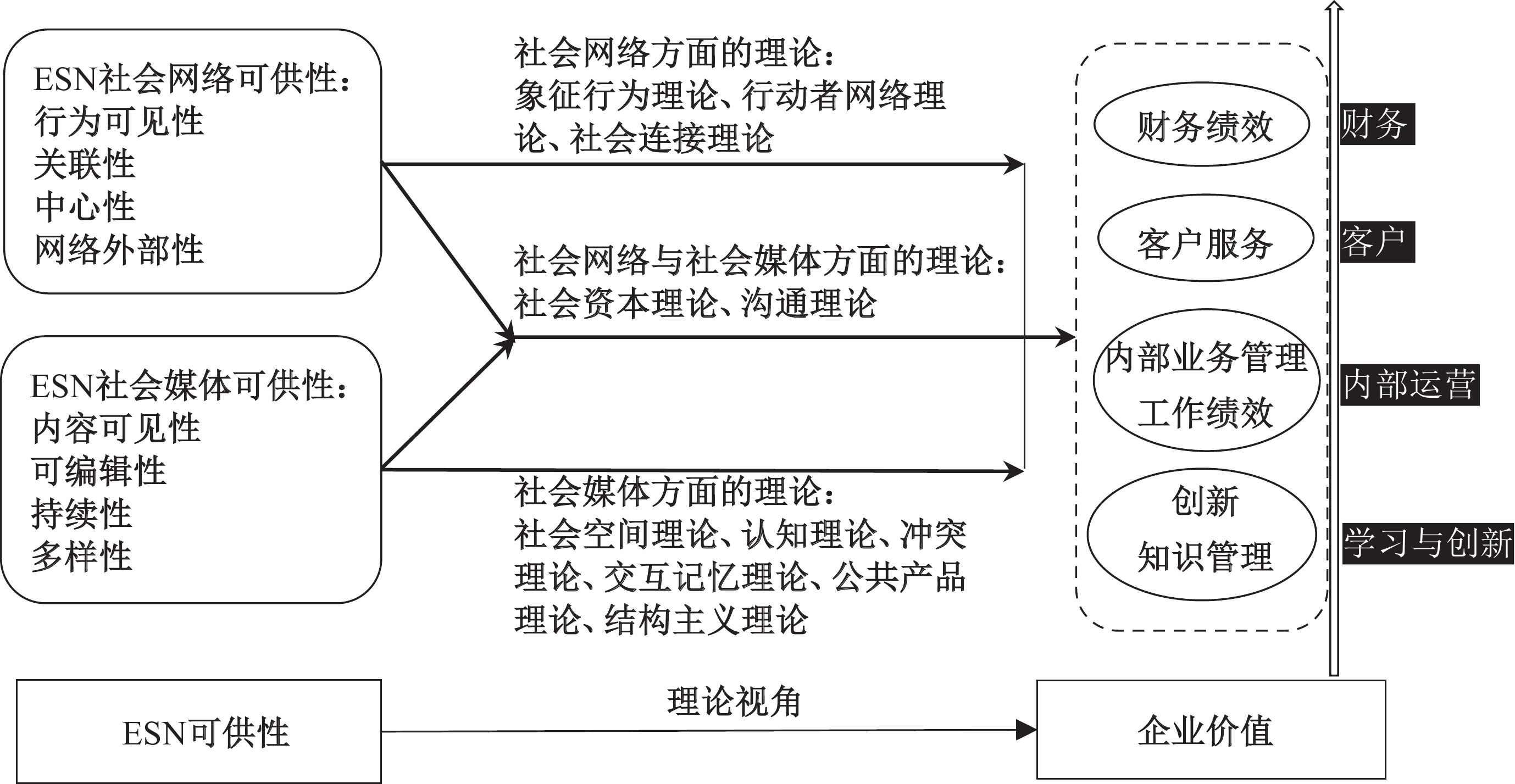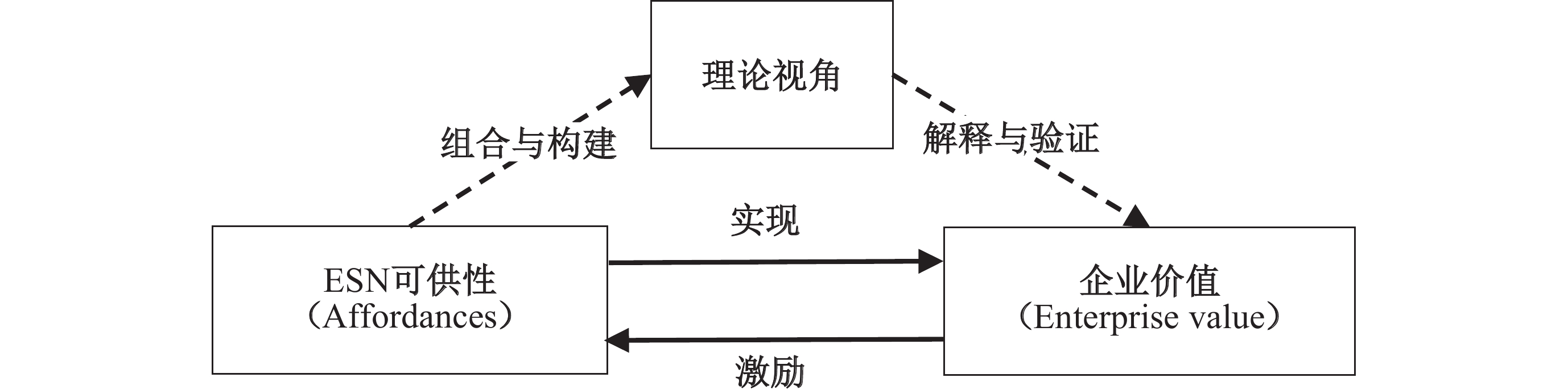 价值是价值客体的功能和特征对价值主体的生存和发展需求所具有的意义(王永昌,1986),是表示主体需求和客体属性相统一的哲学范畴,是对主、客体在价值关系层面性质的概括和反映(鲁延红,1988)。可供性概念确切地描述了ESN对企业价值需求满足的可能性,同时企业价值的满足也进一步激励企业使用ESN,这一逻辑也被Karahanna等(2018)学者用来讨论社交媒体对个人心理需求的满足。本文借鉴这一逻辑,利用“可供性”探讨ESN对企业价值的实现。但是单纯的探讨可供性对企业价值的影响,忽视了理论的重要作用——理论可以通过组合、构建的方式剖析多种可供性影响企业价值的理论完备性,并且从一个相对独立的角度解释、验证现象背后的内在机制。因此,本研究在可供性、企业价值的研究框架中加入理论视角的分析,最终的概念框架如图1所示。