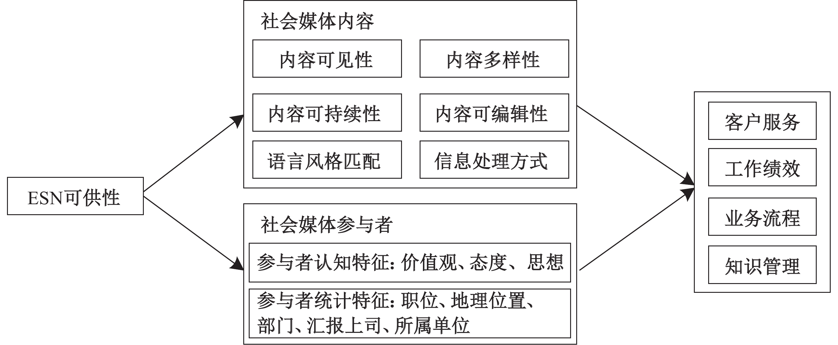 社会媒体内容影响机制强调内容可见性、多样性、可持续性、可编辑性、语言风格匹配、信息处理方式对企业价值的影响。Karoui(2015)以ESN为背景,强调领域的概念,认为某个领域中参与者的信息可以视为符号,这种符号作为参与者的一种个人象征,对于其他参与者来说具有可见性,能影响其他参与者的参与行为,即信息本身的可见性,驱动信息的使用和感知;Huang等(2015a)则从信息产生的不同方式讨论了内容多样性对企业的影响,组织使用ESN产生了两种内容:组织发布的内容(organization published content)和员工自我生成的内容(user-generated content),多元化的信息增强了企业内部交流环境的多面性,更加多元的交流环境也意味着信息来源和内容更加多样化,这种多样化可能与主流信息相冲突,而当员工之间存在冲突,ESN上内容的可见性能够使冲突内容及时暴露,有利于加强企业内部员工之间的协作,促进员工达成共识,对沟通有独特的促进作用,有效改善企业内部管理(Huang等,2015a);Wu(2013)则从主题的角度,认为信息主题的多样性会对员工的工作效率有比较大的影响,而信息的沟通频率则对工作职位的安全有较大的影响;Gunarathne等(2018)从社交媒体内容和形式多样性的角度研究企业客户服务的管理策略,认为存在两种效应:社会媒体的直接效应和旁观者效应,对不同的客户应采取差别化的对待。