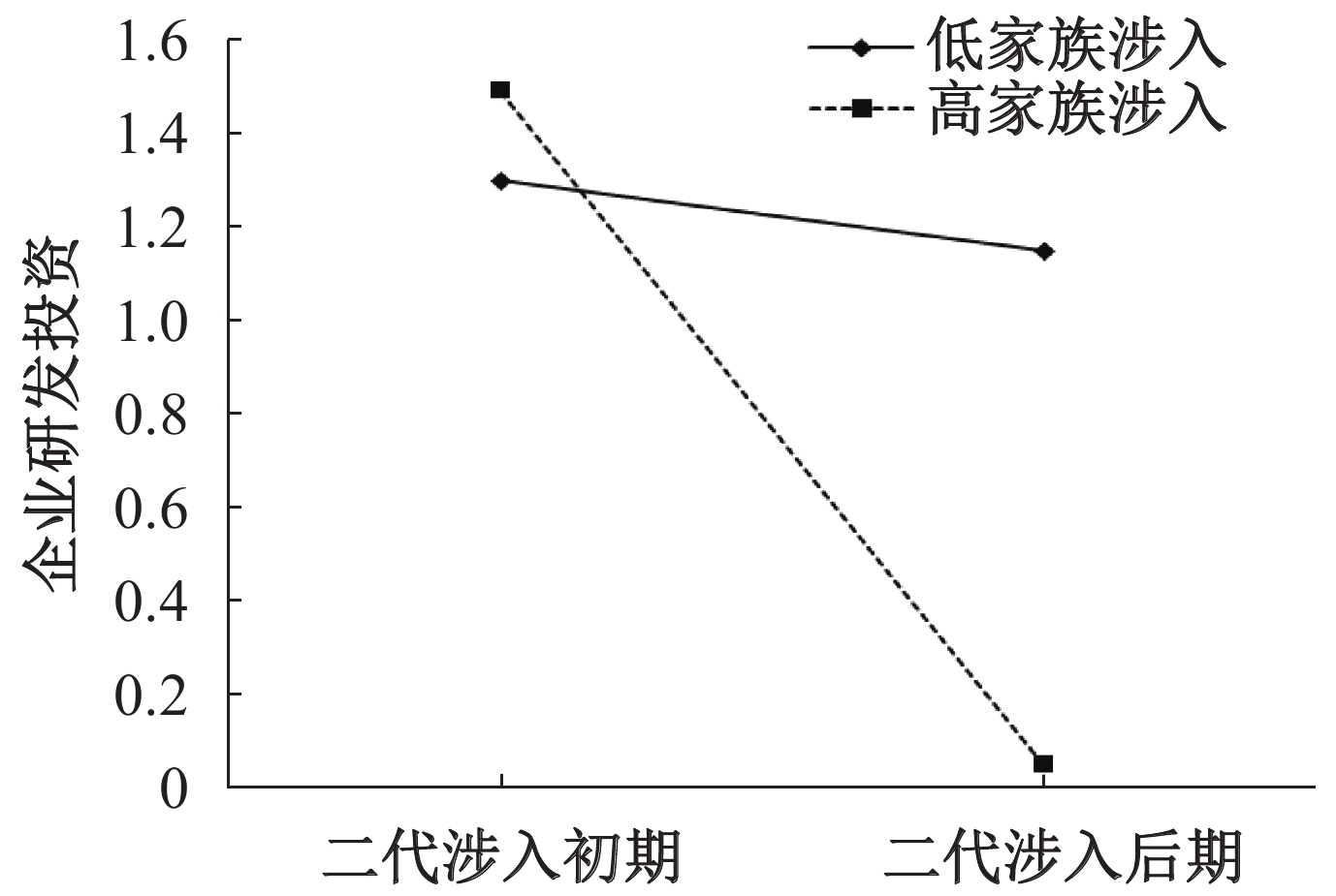 二代涉入初期的主要目标是构建合法性,TMT中的家族高管涉入水平影响二代对于如何构建合法性的认知,当担任高管的家族成员较多时,家族在企业中的影响力就越大,家族逻辑越会影响管理者的决策制定(Richards等,2019),此时接班人合法性主要取决于该二代能否满足家族成员们的不同需求(Miller等,2011),因此,在这种环境下,二代风险规避的偏好会更加严重,更想要给家族成员提供稳定的收入、财富安全感,并保证家族对企业的绝对控制以构建自身合法性(Morck等,2005;Schulze等,2001),从而使二代在创新投入决策中扮演阻碍者的角色;反之,当TMT中家族成员涉入较少时,家族成员在企业中的影响力较小,高管组成结构更类似于非家族企业,此时接班人的合法性主要源自其自身的工作能力及对企业成长的贡献程度,二代参与决策时会更多地考虑以企业为中心的目标,因此,这种环境下的二代不会一味追求风险规避,一定程度的冒险行为是可以接受的(Kraiczy等,2015),尽管创新投入是一种风险决策,但创新可以提升企业竞争力和最终的生存能力(Ahuja等,2008),从而使二代在创新决策中扮演推动者的角色。