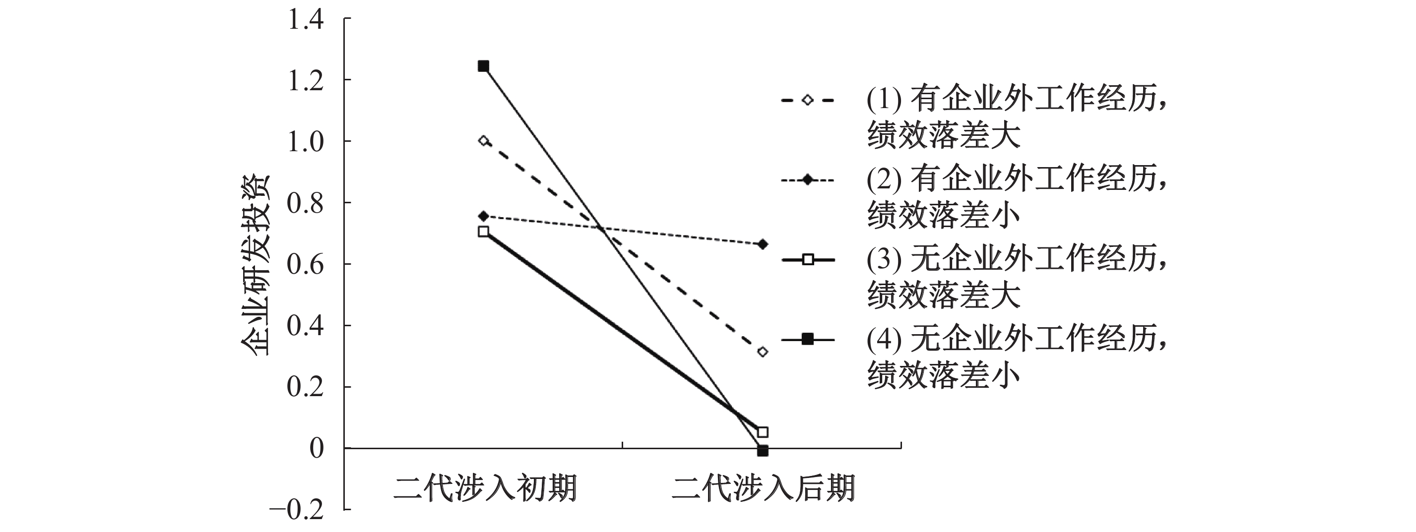 除了上述对创新投入的直接调节效应之外,本文提出随着绩效落差的增加,二代企业外工作经历对主效应的影响会被放大。当企业绩效不佳时,以企业为中心的目标明显比以家族为中心的目标要更重要,因为若企业处于绩效威胁的情况下,家族也必受波及,这与有企业外工作经历的二代所固有的企业逻辑思维模式相吻合,所以当绩效落差较大时,二代企业外工作经历的作用会被放大,从而导致他们在参与决策时更有可能考虑企业经济目标,而不会对家族SEW目标过分关注,鉴于研发投资对于企业的竞争能力和最终生存能力益处良多(Ahuja等,2008;Palmer和Wiseman,1999),成功的创新投资可以提高家族企业的地位和声誉(Gomez-Mejia等,2014),在有利于企业目标实现的同时,还有利于家族目标的达成,因此有企业外工作经历的二代在面临绩效落差时更愿意推动家族企业创新投资。