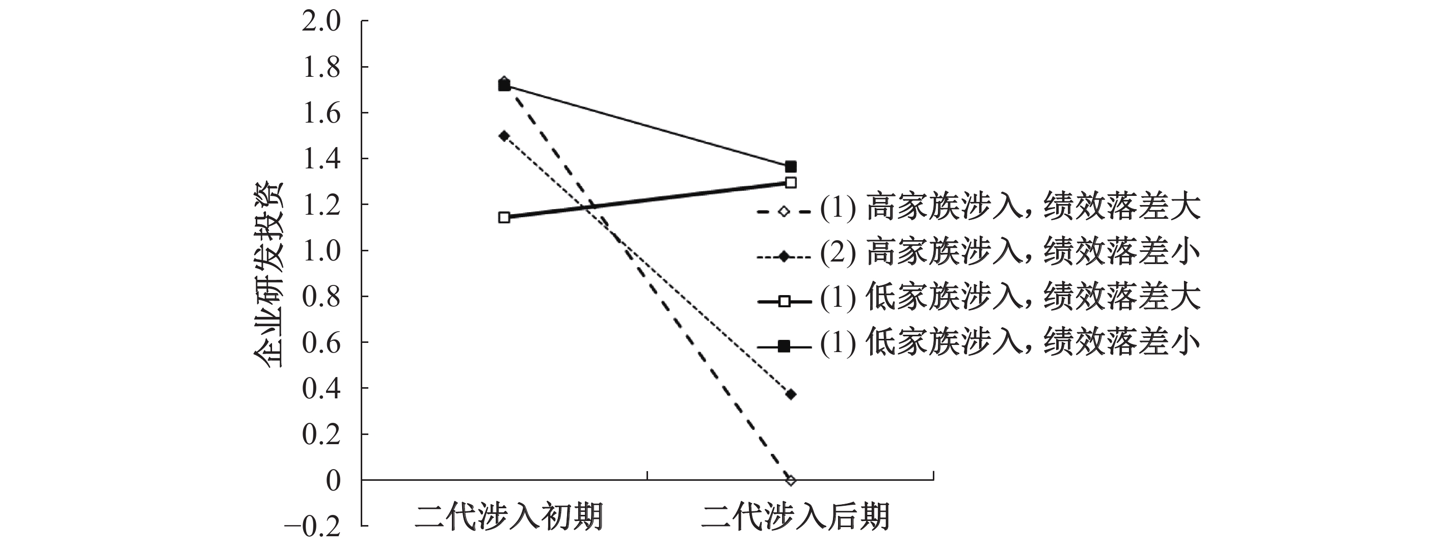 前文已经论述了TMT中家族成员涉入水平会阻碍家族企业创新投入,本文提出随着绩效落差的增加,TMT中家族成员涉入对主效应的影响会被减弱。当企业绩效不佳时,二代的目标导向是以企业为中心的经济目标,他们倾向于加大创新投入以扭转绩效落差的危险局面(Chrisman和Patel,2012),此时家族高管在抵制二代创新方面并没有什么影响力,更有可能支持二代的投资偏好,风险厌恶程度减弱,否则家族成员间会造成更大的冲突,因为他们深知若此时不给予财务目标更高的重视程度,尤其当家族财富和企业命运紧密相连时,在绩效表现越来越差的同时还会损失家族SEW,从而给家族和企业带来双重损失,因此,TMT中家族成员涉入较多的企业在面临绩效落差时更愿意推动家族企业创新投资。综上所述,本文提出如下假设: