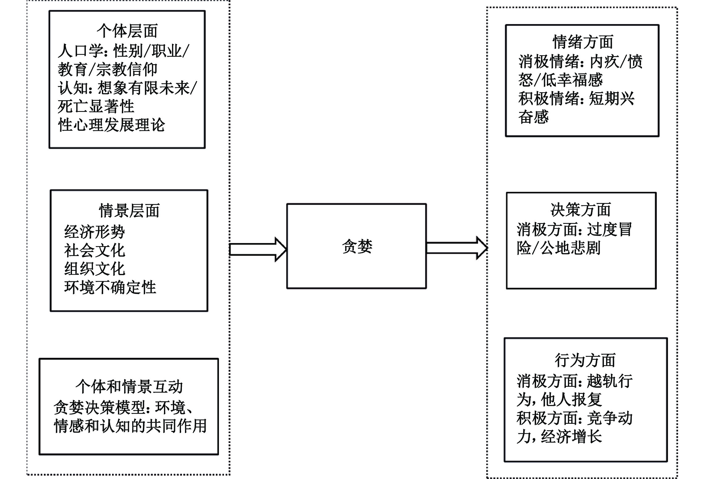贪婪常常出现在组织与经济丑闻中(Wang和Murnighan,2011),并被广泛认为是导致金融丑闻如股市泡沫、金融危机的原因之一(Anderson,2014;Seuntjens等,2019)。这些金融丑闻很大程度上是由于金融机构代理人的贪婪导致的过度冒险决策。伴随贪婪而来的强烈情绪会激发人的非理性的一面,阻碍人们在决策过程中有效地理性思考判断问题(Bazerman等,1998)。Mussel等人(2015)提出贪婪作为一种稳定的人格特质可以预测风险决策,特别是当这种人格特质被情境特征激活时,即贪婪可以解释在不同环境下的风险和鲁莽行为,高贪婪特质的个人会冒更大的风险来最大化货币收益。另外,公地悲剧也表明个体的贪婪会对未来的资源可得性造成负面影响,最终导致集体对资源的过度使用(Seuntjens等,2015a)。