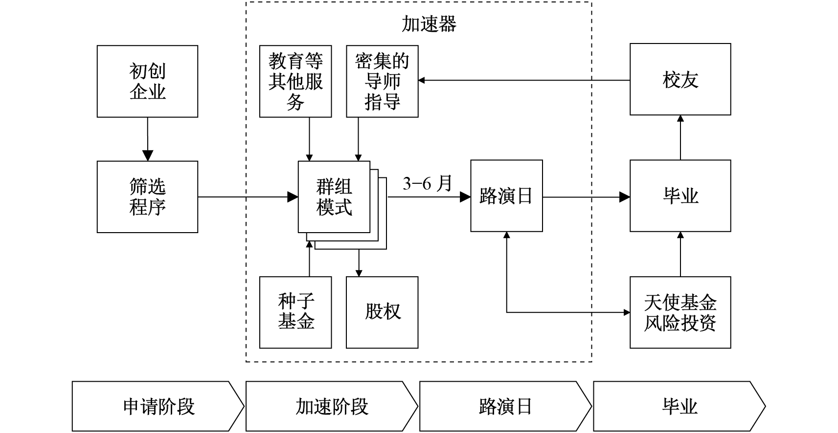 (二)加速阶段。若是通过加速器的筛选程序,多数加速器会以交换少量股权(2%—10%之间,一般为6%)的方式,向创业团队提供种子基金投资(25 000—150 000美元不等)(Drove等,2017)。不同于孵化器,加速器一般采用群组(cohorts)模式。加速过程一般维持3—6个月,期间提供密集的导师指导以及教育服务等。