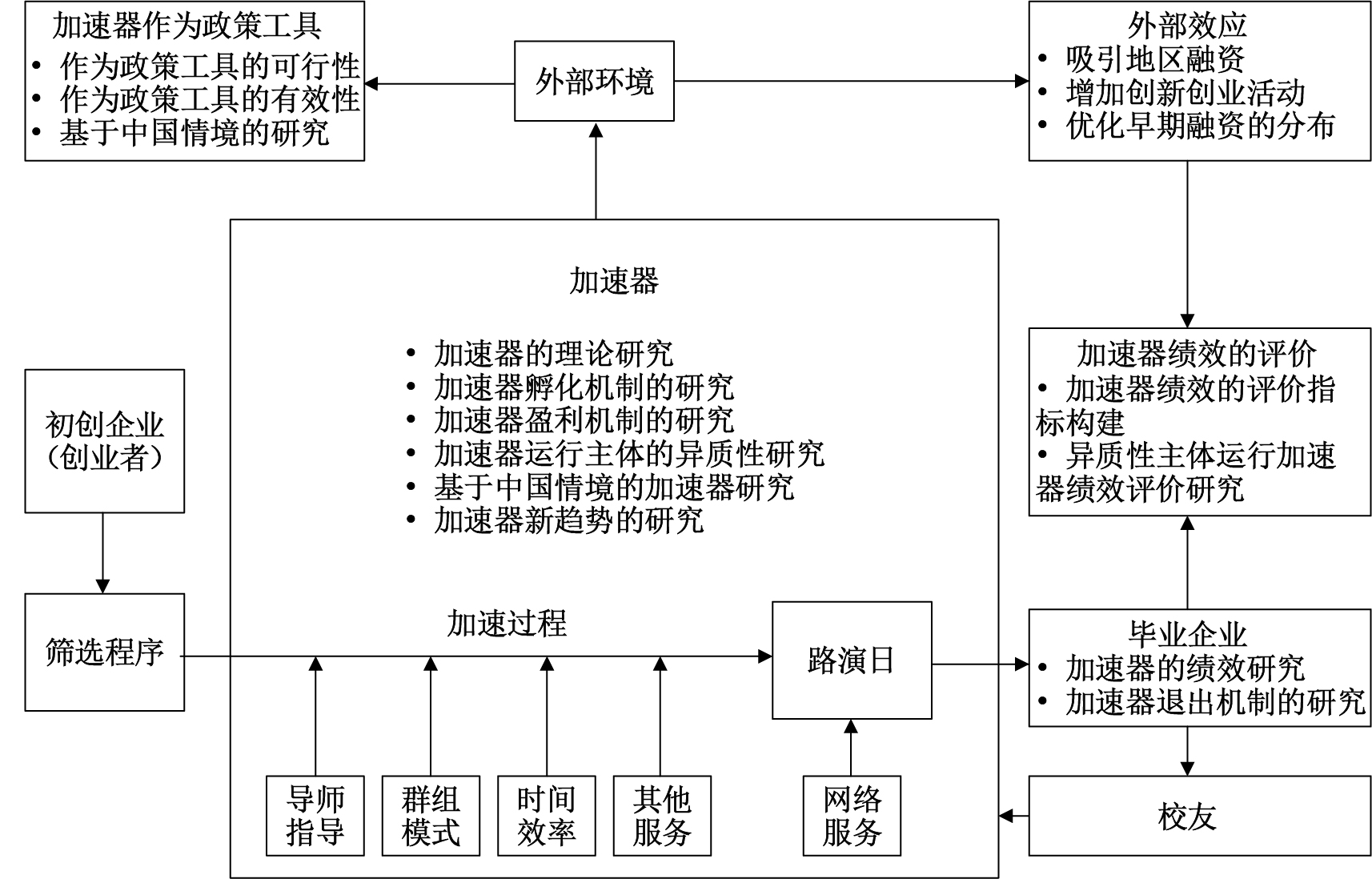 基于以上背景,本文对国外加速器研究相关文献进行了系统梳理,尝试回答如下问题:第一,加速器是什么,它与现有的孵化模式有何区别?第二,加速器的运行主体有哪些,不同运行主体的加速器有什么差异?第三,加速器是如何运作的,其孵化绩效如何?第四,加速器的发展对宏观环境和地区经济发展有何影响?最后,加速器研究存在哪些不足,未来的研究方向是什么?针对上述研究问题,本文从加速器的内涵、运行主体、运行模式和外部效应四个方面对加速器的研究现状进行了系统回顾,并在总结现有研究不足的基础上,对未来研究方向进行了展望。