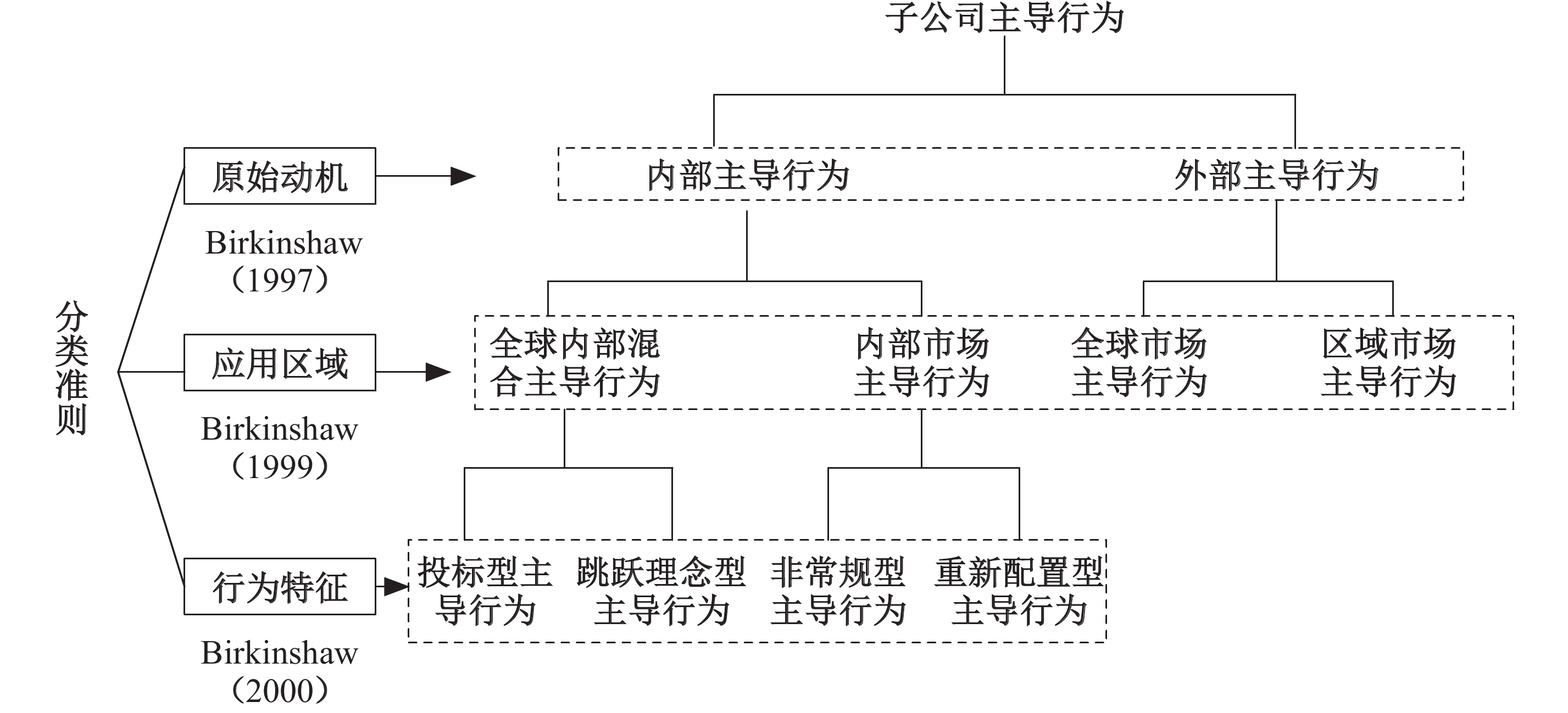 Birkinshaw的系列研究开启并深化了对子公司主导行为的类别划分(Birkinshaw,1997,1998a,1999,2000)。起初,着眼于主导行为机会最先被识别地点的差异(原始动机)将子公司主导行为划分为内部主导行为和外部主导行为(Birkinshaw,1997)。其中,内部主导行为动机源于跨国公司系统内部,机会识别产生于子公司管理者同跨国公司系统内其他成员间的交互作用,外部主导行为动机则来源于系统外部,机会识别根植于子公司与区域消费者、供应商及其他利益主体间的协调互助与沟通合作(Birkinshaw,1998a)。以此为基础,Birkinshaw(1999)对内外部子公司主导行为进行了细分。依据“应用区域”准则,将内部主导行为划分为内部市场主导行为和全球内部混合主导行为。内部市场主导行为注重跨国公司网络内效率的改进及行为的合理化,原始动机及应用区域都在企业内部。与之不同,全球内部混合主导行为的应用区域在企业外部,但原始动机却来源于企业内部。同样依从“应用区域”准则,外部主导行为被划分为区域市场主导行为和全球市场主导行为。两者的宗旨都是为消费者开发及提供新的产品与服务,差异在于服务主体所属地域不同,前者根植区域,后者则着眼全球(Birkinshaw,1998b)。延续上述思路,Birkinshaw(2000)遵照“行为特征”准则,对已有归类进一步细化。具体将内部市场主导行为划分为重新配置型主导行为和非常规型主导行为,将全球内部混合主导行为划分为投标型主导行为和跳跃理念型主导行为。