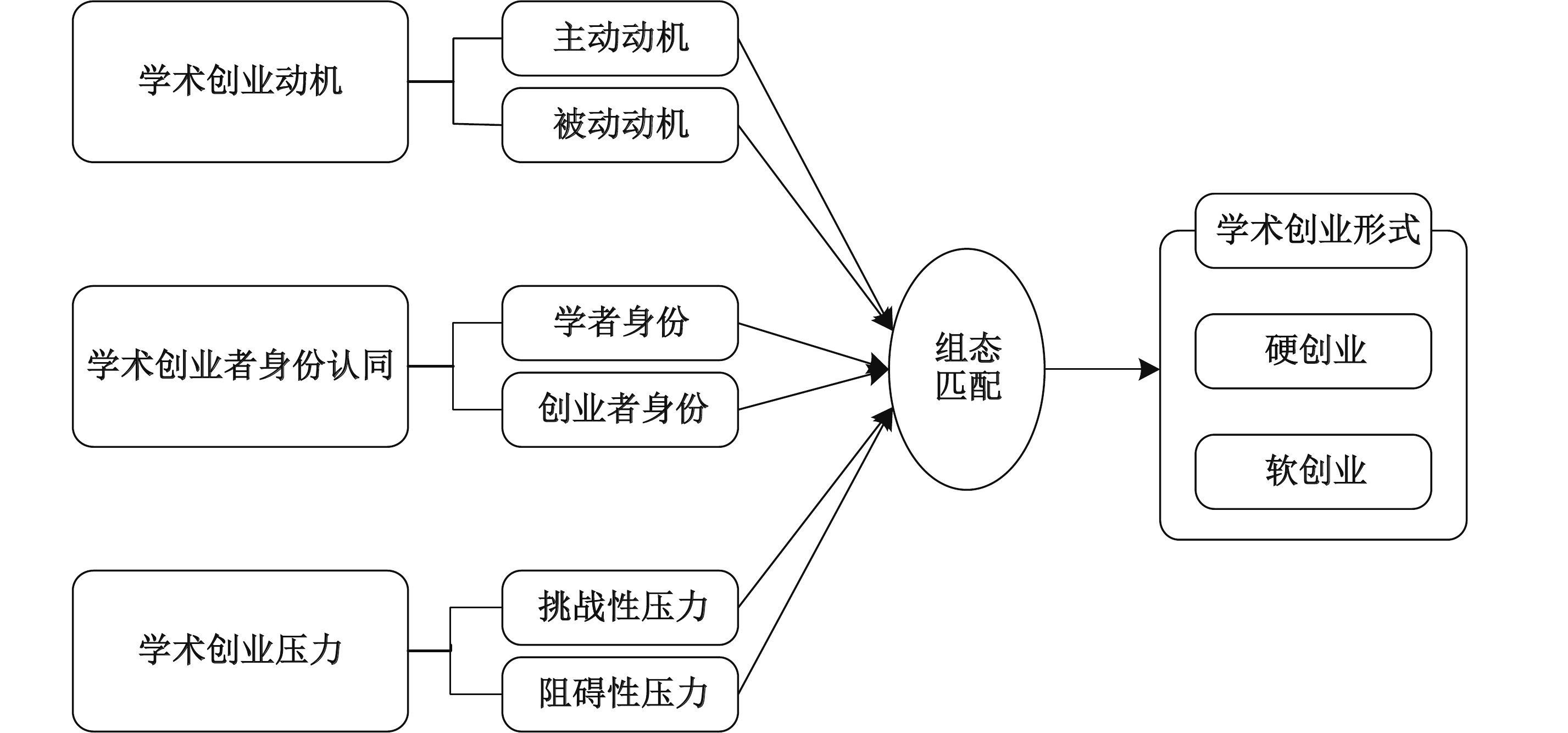 综上所述,学术创业者的学术创业动机、学术创业者身份认同和学术创业压力都会影响学术创业者选择适合从事的学术创业形式。但是这三种心理因素并非相互独立,而是通过协同效应共同影响学术创业者对学术创业形式的选择。根据目标动力学理论,心理目标会引导个体对自身多重心理因素进行自组织重构,进而影响个体的行为决策选择(章凯,2014)。也就是说,学术创业动机、学术创业者身份认同和学术创业压力会通过协同效应共同影响学术创业者选择适合的学术创业形式,且这种影响可能会因为条件间的适配得到强化,也可能通过条件间的替代而相互抵消。因此,本文将借助csQCA研究方法,将上述三种心理因素作为前因条件共同纳入到一个整合的研究框架中,揭示学术创业者所适合的学术创业形式选择的多元组合路径。研究框架如图1所示。