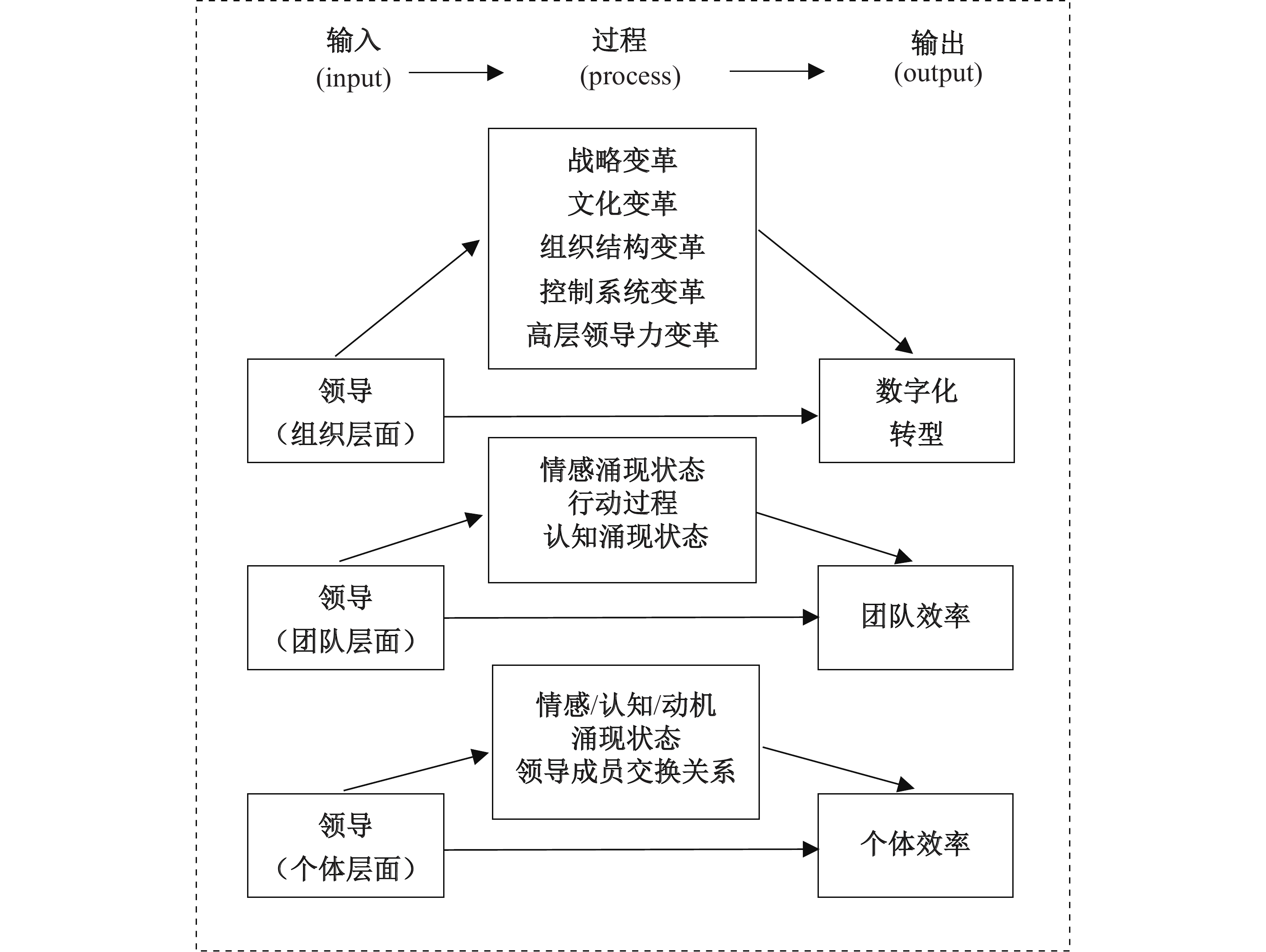 输入包括多个层次的特征和资源(Kozlowski和Ilgen,2006)。领导力是一种无形资源,对组织数字化转型具有重要意义(吴江等,2021)。组织转型是指组织的核心要素发生根本性的变化(Meyer,1982)。Romanelli和Tushman(1994)认为组织核心要素是那些处于组织关键领域的战略要素、文化要素、结构要素、控制系统要素、高层领导力要素等。数字化转型是组织转型中的一种典型模式,领导在组织层面推动组织核心要素变革进而促进组织数字化转型。团队层面的中介因素包括情感涌现状态、行动过程和认知涌现状态(Larson和DeChurch,2020)。情感涌现状态是指团队在情感方面达成共享,进而塑造具有内在动态性的状态;行动过程是指团队执行促使团队目标实现的活动;认知涌现状态是指团队形成在认知方面具有共享性、动态性的心理状态(Kozlowski和Ilgen,2006)。数字化时代,领导在团队层面改善团队情感涌现状态、行动过程、认知涌现状态进而提升团队效率。领导除了影响团队过程和状态,还会影响每个成员个体(Morgeson等,2010)。个体层面常见的中介因素主要是个体涌现状态(包括情感、认知、动机)以及领导成员交换关系(Liao,2017)。一方面,个体涌现状态是个体的心理特性,具有动态性,随着情境输入的变化而变化,在数字化情境中,将随着不同领导行为的输入而发生改变,进而影响个体效率(Liao,2017)。另一方面,领导成员交换关系作为描述领导和个体成员二元互动的经典变量,是研究领导对个体效率的重要中介(Liao,2017)。图2为本部分的研究框架。