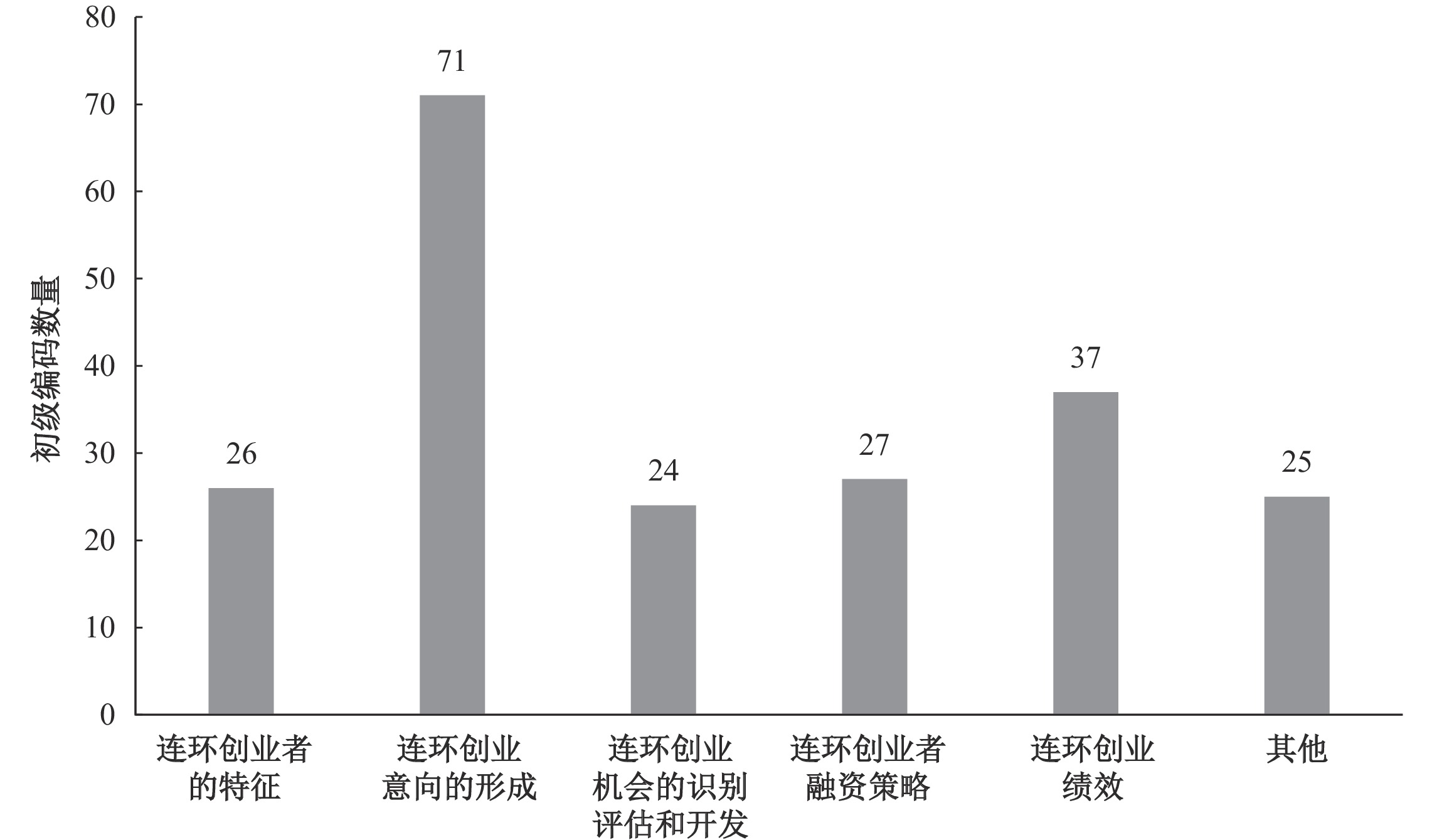 具体的编码过程如下。首先,两位研究人员统一编码原则,针对学者提出的命题和假设进行编码提炼,在严格遵循文献原意的基础上独立进行初级编码,并建立初级编码间的因果关系。之后,两人独立对初级编码进行提炼,以形成类属、确定类属间的关系,并据此进行聚焦编码。最后,研究人员就不一致的编码进行充分讨论,在听取创业学、管理学相关专家意见的基础上,删除、合并、新增了部分编码,最终共形成210个初级编码。通过对这些初级编码进行归纳和提炼,排除了25个无法聚焦的零散编码,共形成22条不重复的聚焦编码。在充分考虑编码原意的基础上,根据聚焦编码、初级编码之间的内在联系,归纳了连环创业相关研究的五个主题(如表1所示):(1)连环创业者特征;(2)连环创业意向的形成;(3)连环创业机会的识别、评估和开发;(4)连环创业者的融资策略;(5)连环创业绩效。此外,有部分编码在不同主题下都可以当作前因变量,如创业认知、先前经验等,为全面反映本主题下的研究内容,这些编码被重复放入各个主题。初级编码在各个主题中出现的数量如图1所示。