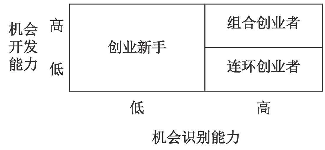需要注意的是,尽管Westhead等(2005)发现组合创业者识别机会的能力优于连环创业者,但尚未有研究检验二者行为差异背后的内在机理。Parker(2014)猜测,创业者在机会识别和机会开发方面的差异决定了个体能否成为组合创业者或连环创业者(见图4)。兼具高水平的机会识别能力和机会开发能力的个体,更有可能成为组合创业者。而机会识别能力较高但机会开发能力较低的个体,更可能成为连环创业者。
