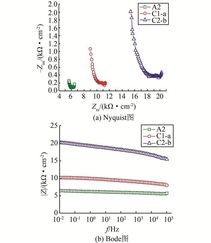 | 图 13 A2掺两种阻锈剂的Nyquist图和Bode图 Figure 13 Nyquist graph and Bode graph of steel bars in A2 with two kinds of corrosion inhibitors |