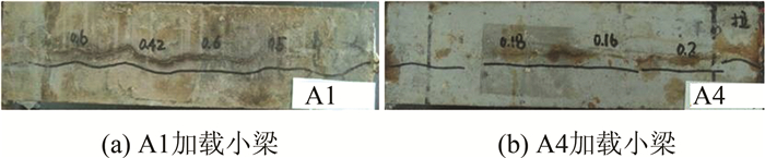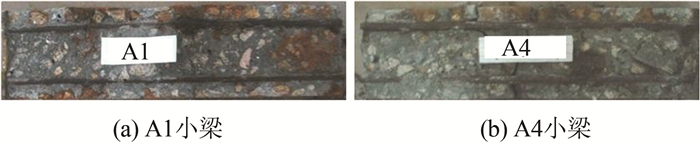 将小梁破型之后可以发现,受拉区一侧的锈蚀产物明显多于受压区,如图 16所示,再一次证实了荷载的作用加速了钢筋的锈蚀,此外,不掺矿物掺和料的A1小梁产生的锈蚀产物明显多于粉煤灰掺量为40%的A4小梁,说明矿物掺和料的掺入对抑制钢筋锈蚀有明显帮助.