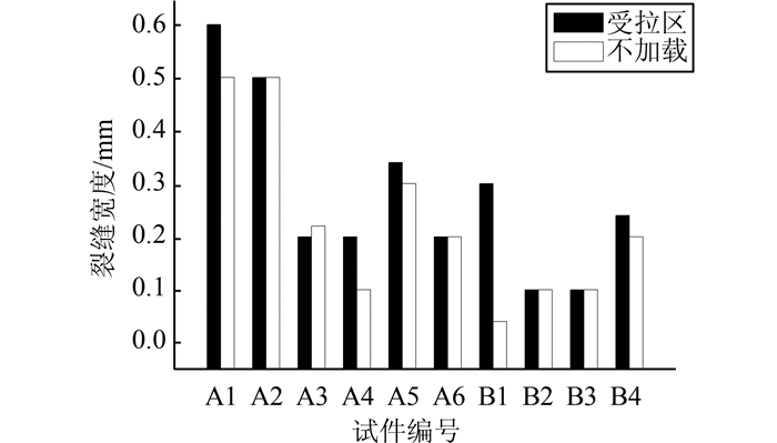 通电锈蚀期间,钢筋的锈蚀产物充满混凝土内部孔隙之后会溢出小梁表面并形成堆积.在裂缝处有青绿色Fe(OH)2或红褐色Fe2O3锈蚀产物出现.清除表面锈蚀产物,可见小梁表面顺筋方向产生了长度不一的裂缝,如图 14,从图中可看出,各小梁受拉区裂缝宽度基本大于不加载小梁裂缝宽度,说明荷载加速了锈蚀产物的生成,从而增大混凝土保护层中的锈胀拉应力.