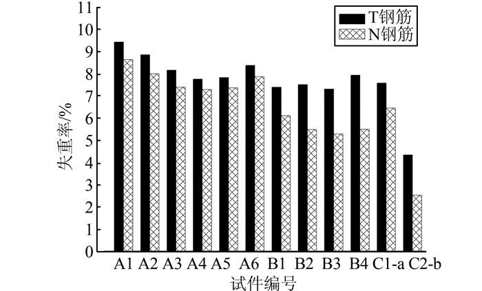 试验对单掺A系列、复掺B系列以及掺阻锈剂加载小梁和不加载小梁中锈蚀后钢筋的质量进行了称重,通过下式计算失重率(见图 17):
