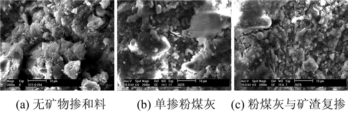 图 2分别为不掺矿物掺和料、单掺粉煤灰和复掺粉煤灰与矿渣混凝土试件的扫描电镜图片,从图中可以看出,掺入矿物掺和料的试件其细观结构较为致密,其中复掺粉煤灰与矿渣效果更好.