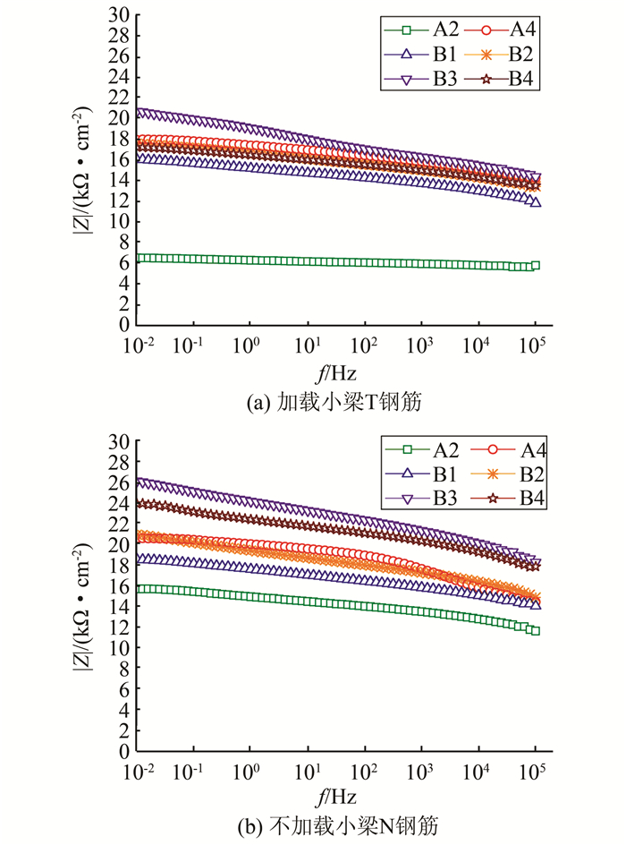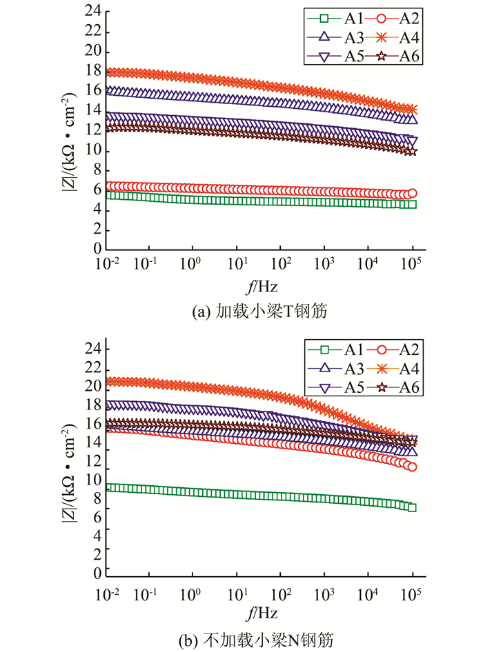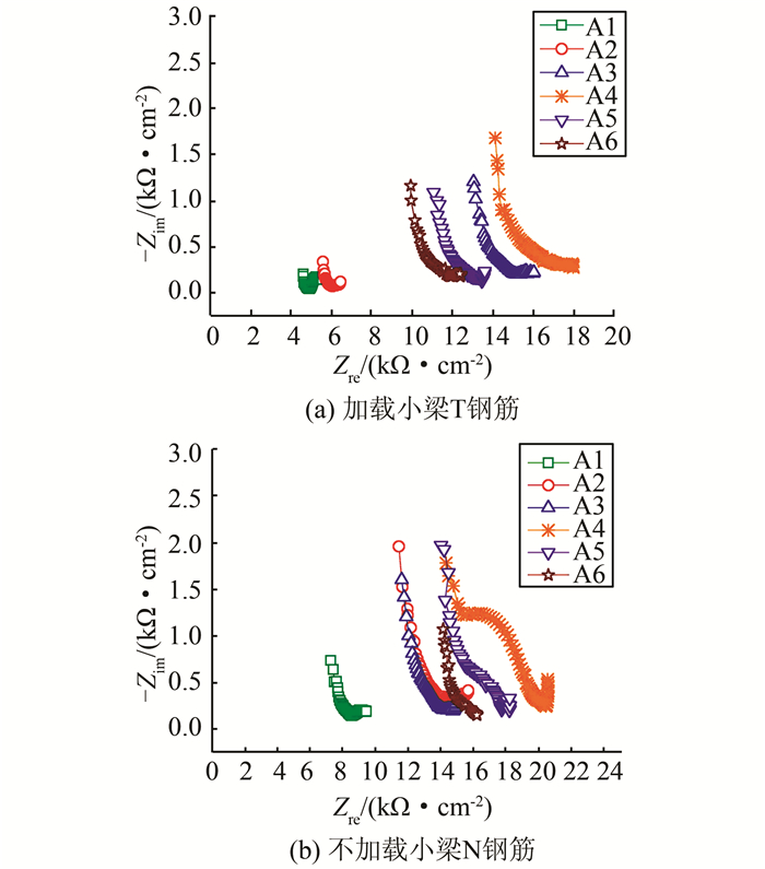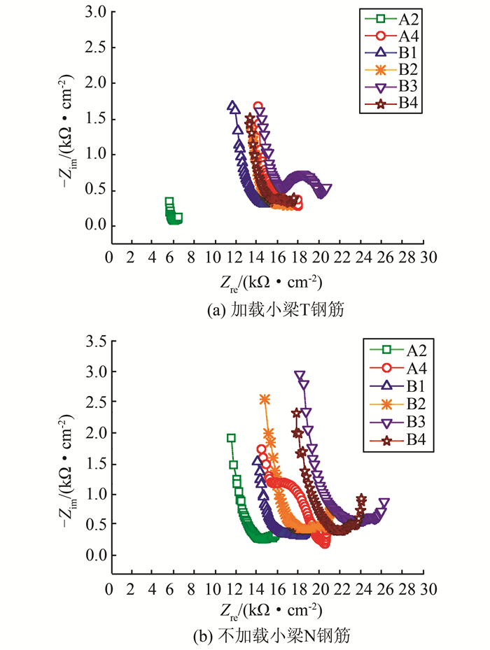 图 3、4为A系列的Nyquist图,图 4中曲线低频段呈直线表示钢筋钝化,可看出,经过28 d锈蚀后,小梁中钢筋Nyquist图低频端明显收缩,相应的钢筋腐蚀速度急剧增大.此外,对比锈蚀前后钢筋Nyquist图上高频端可以发现,图 4上高频端起点较图 3相比往左平移;高频端的坐标值对应保护层的电阻,而钢筋的腐蚀速度和混凝土电阻率成反比关系[13],故以上现象都表明混凝土保护层电阻变小,锈蚀速率变大.
