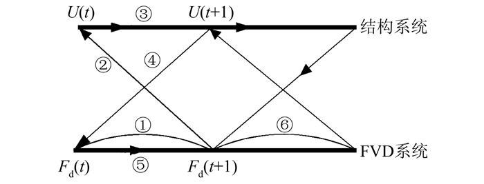 对于带有FVD的结构,FVD的阻尼力及其两端的结构上的速度响应为耦合变量.结构系统的计算可采用现有FEM软件作为其求解器.FVD系统的求解器可另外建立.建立FVD系统的求解器可使用现有FEM提供的开发工具实现,例如在ANSYS软件上使用其ADPL语言建立FVD的求解器.这个工作实际上是对现有FEM软件进行2次开发.该方法根据t时刻FVD的阻尼力Fd(t),预估t+1时刻FVD的阻尼力Fd(t+1),并将其代入到动力方程式(4)中,推进求解t+1时刻结构的运动响应U(t+1).若在该积分时间步内,相邻2个迭代步的响应解满足精度要求,则进入下一个时间步,否则,将新的响应解代入到阻尼力方程式(3)中求出新的FVD阻尼力继续进行计算.其流程图如图 1所示,该方法相比于松耦合方法在理论上保证了时间的同步性.