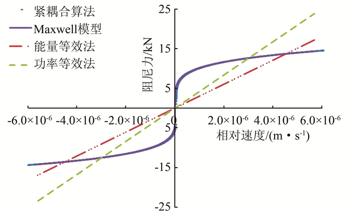 在图 4中,同时还将能量等效法和功率等效法的阻尼力-速度曲线与Maxwell模型所描述的阻尼力-速度曲线做了对比.可见能量等效法和功率等效法完全忽略了FVD的非线性性质,会带来很大的计算误差.