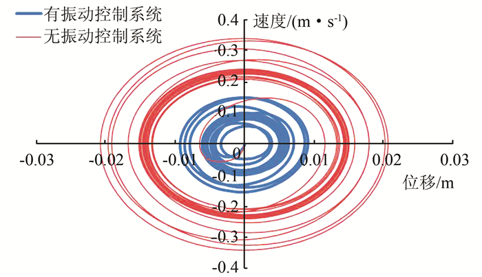 为比较FVD振动控制系统的效果,取10号FVD与闪蒸罐连接处的结点A,比较有/无安装FVD的响应.图 5给出了有/无安装FVD时该处在X向的振动状态空间曲线.从图 5中可见有/无安装FVD,结构经过一个暂态的冲击后进入稳态响应.最大响应出现在暂态.安装有FVD时该点的响应明显小于没有安装FVD时的响应,其速度幅值约减少69.88%,位移幅值约减少37.10%.FVD振动控制系统的减振效果十分明显.