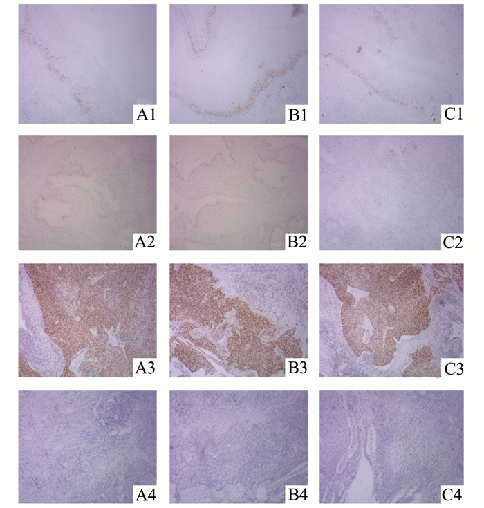 图 1 免疫组化法检测STAT3(A), Nanog(B)和HMGB1(C)在宫颈组织的表达(SP ×200) A1, B1, C1:慢性宫颈炎组织的阳性表达;A2, B2, C2:慢性宫颈炎组织的阴性表达;A3, B3, C3:宫颈癌组织的阳性表达;A4, B4, C4:宫颈癌组织的阴性表达 |