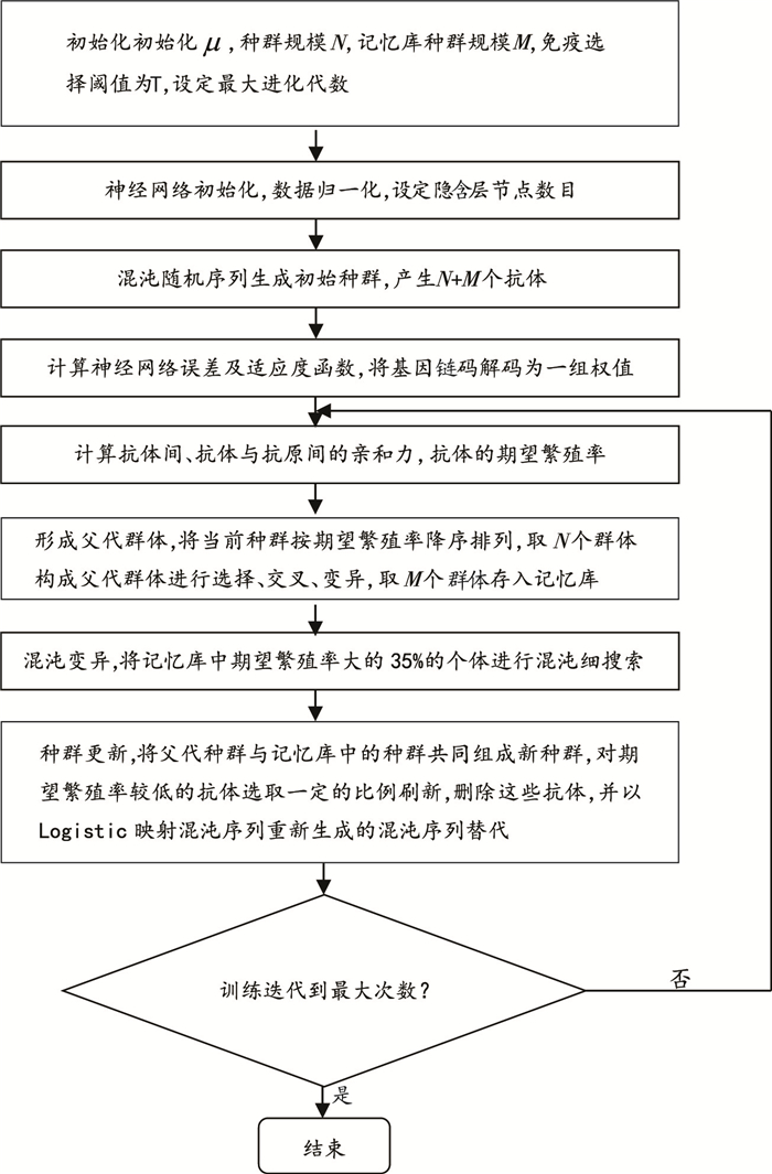 步骤1:对控制参数μ进行初始化,种群规模记为N,记忆库种群规模记为M,T为免疫选择阈值,对最大进化代数进行设定;初始化神经网络,数据归一化,采用Kolmogorov定理设定隐含层节点数目。