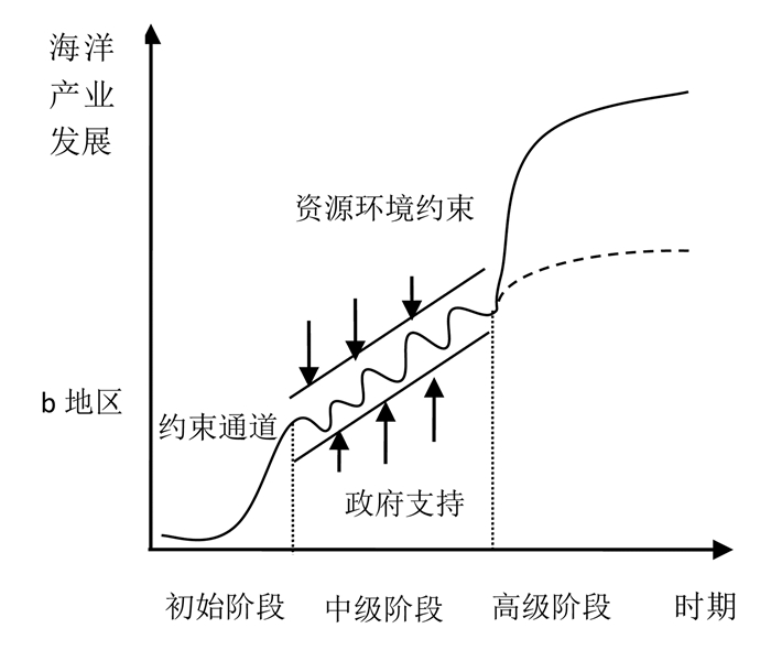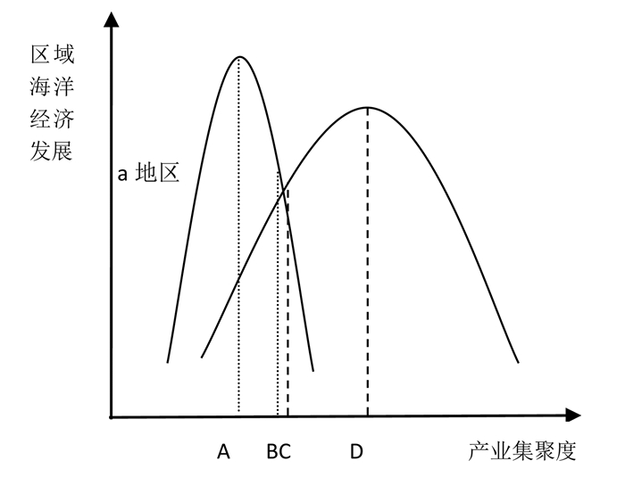 ④ 在图 3中, 由于发达地区特定海洋产业发展潜力可能高于、低于或等于欠发达地区该海洋产业发展潜力, 故a地区曲线最高点与b地区曲线最高点大小关系并不确定。在现实中, 通常发达地区海洋产业发展潜力高于欠发达地区, 因此在不影响研究目的情况下本图采用这一大小关系。