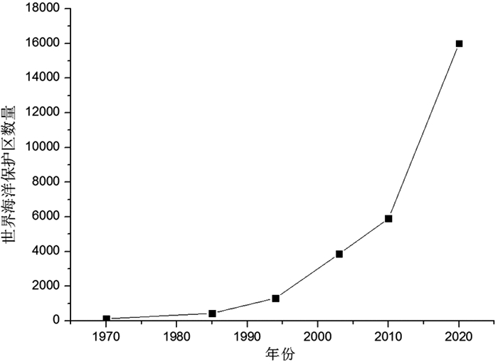 二、国际海洋保护区发展历程、现状和趋势 (一) 国际海洋保护区发展历程 1、海洋保护区数量1886年建成的澳大利亚新南威尔士州皇家公园是全球首个海洋保护区,直到1990年前后,海洋保护区数量增长较为缓慢,1992年联合国通过《生物多样性公约》,海洋保护区建设成为重要议题,保护区数量增速加快。2010年的《生物多样性公约》第10次缔约方大会提出保护珊瑚礁等脆弱生态系统的爱知目标10,增加和改善保护区的爱知目标11。各国为响应该目标,海洋保护区的数量迅速增长,[21]如图 1。Devillers对全球海洋保护区的类型和模式进行了审查,发现偏远的大型海洋保护区数量快速增长。[22]