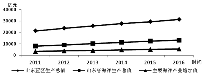 图 2 山东半岛蓝色经济区生产总值变化趋势 注:数据根据2011—2016年山东省经济社会发展统计公报整理而成。 |