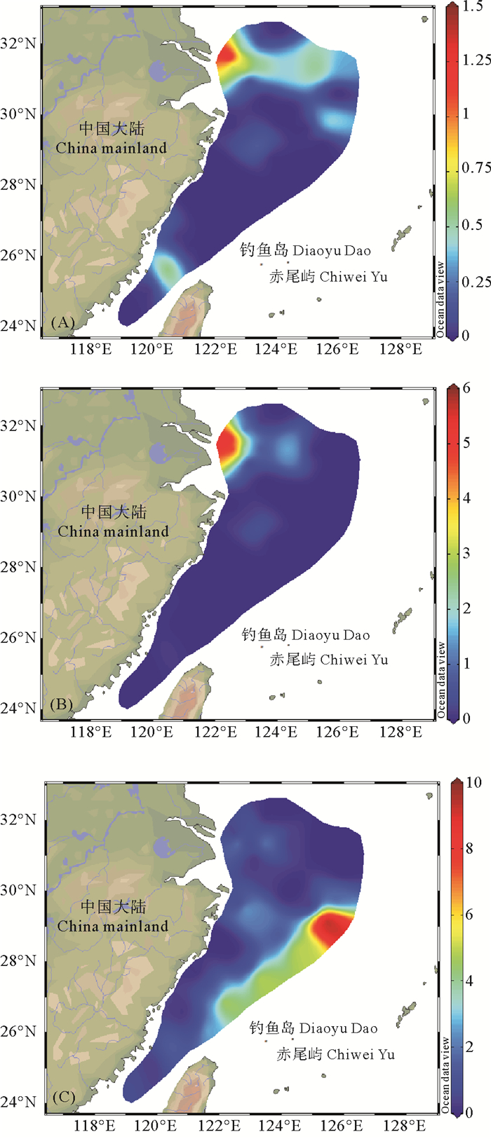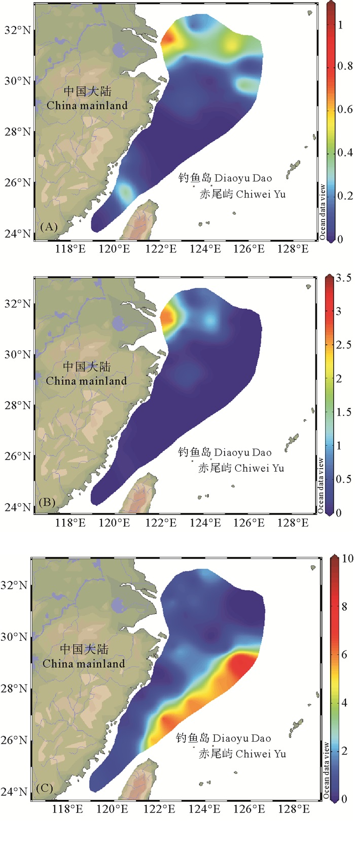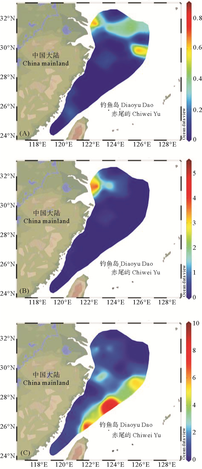 图 7 夏季东海表层(A)、10 m层(B)和底层(C) 水体中DMHg/DGM的平面分布 Fig. 7 Spatial distribution of DMHg/DGM in surface (A), 10 m (B) and bottom (C) water of the East China Sea in summer |